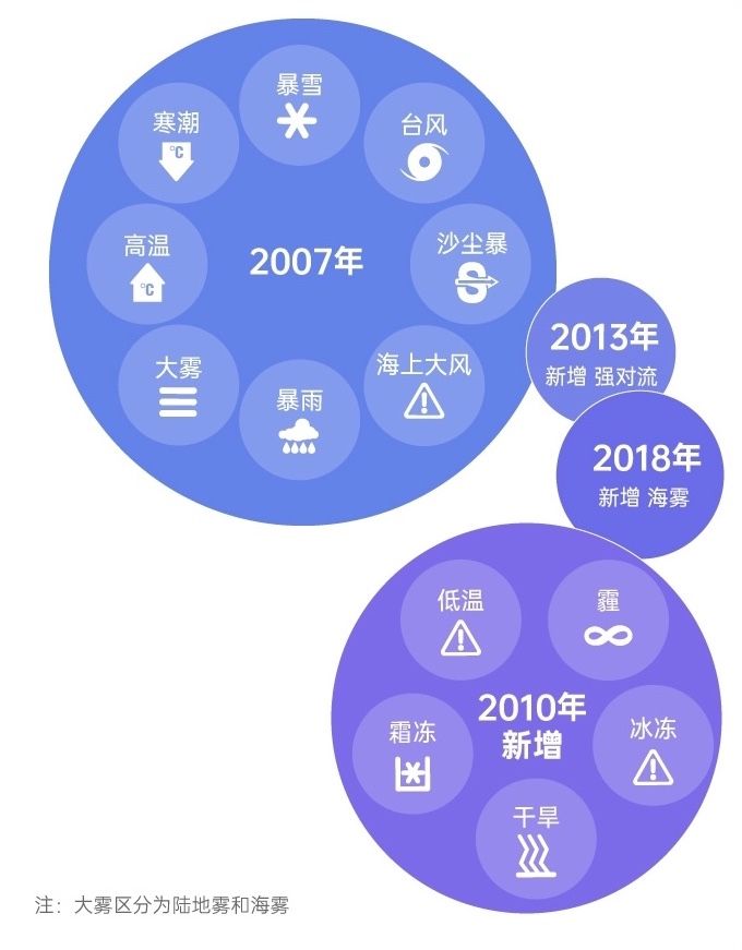 2007年,中国气象局制定并发布《中央气象台气象灾害警报发布办法(试行)》,适用于8类气象灾害预警;2010年,气象灾害预警增至13类;2013年新增强对流预警发布办法,至此气象灾害预警增至14类。2018年,在大雾气象灾害预警中还新增了海雾预警发布办法。