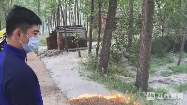 5月16日上午,灌南县消防救援大队人员来到汤沟镇沟东村。走在村里路上,扑面而来的都是飘落的杨絮。路边的地面上甚至是河面上都被杨絮覆盖了一层,像是下一场大雪。在两名消防员的水枪保护下,实验人员用打火机点燃了路边的杨絮,只见杨絮迅速燃烧,像“流淌火”一样快速向前蔓延。