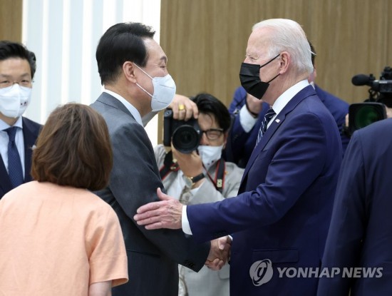拜登和尹锡悦在三星电子半导体工厂首次会面。图源:韩联社