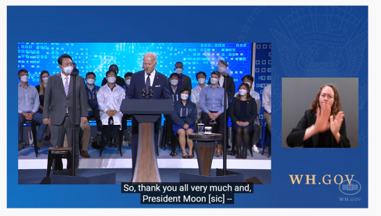 果然,拜登又口误了。据俄罗斯卫星网报道,当地时间20日,美国总统拜登在访问韩国平泽三星园区发表讲话时,又把韩国现任总统尹锡悦(Yoon Seok-youl)的名字同韩前总统文在寅(Moon Jae-in)混为一谈。