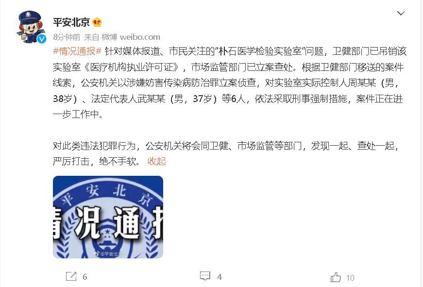 荔枝新闻讯 据@平安北京 5月21日通报,针对媒体报道、市民关注的“朴石医学检验实验室”问题,卫健部门已吊销该实验室《医疗机构执业许可证》,市场监管部门已立案查处。根据卫健部门移送的案件线索,公安机关以涉嫌妨害传染病防治罪立案侦查,对实验室实际控制人周某某(男,38岁)、法定代表人武某某(男,37岁)等6人,依法采取刑事强制措施,案件正在进一步工作中。