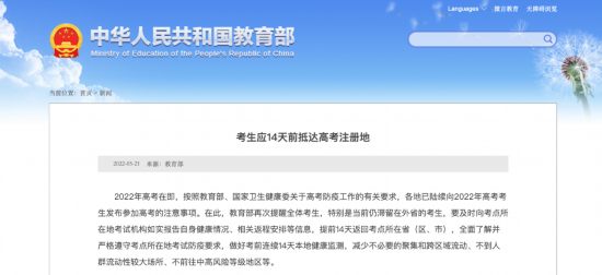 2022年高考在即,按照教育部、国家卫生健康委关于高考防疫工作的有关要求,各地已陆续向2022年高考考生发布参加高考的注意事项。在此,教育部再次提醒全体考生,特别是当前仍滞留在外省的考生,要及时向考点所在地考试机构如实报告自身健康情况、相关返程安排等信息,提前14天返回考点所在省(区、市),全面了解并严格遵守考点所在地考试防疫要求,做好考前连续14天本地健康监测,减少不必要的聚集和跨区域流动、不到人群流动性较大场所、不前往中高风险等级地区等。