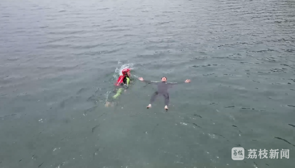 不要用力,不需会水,只要保持这个姿势,人就可以漂浮在水面上。之后,只要耐心地等待救援,就有希望脱困。当我们看到有人落水,很多人会挺身而出,开展各种方式的救援。可是,您知道怎样救人才能既保证自己的安全又能最快救出落水人员吗?现场演示了一名“溺水者”正在水中等待救援,另外一名消防救援人员扮做“救援者”进入河中。
