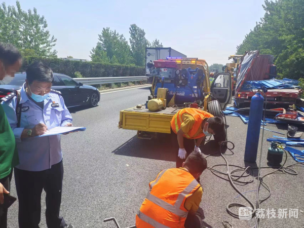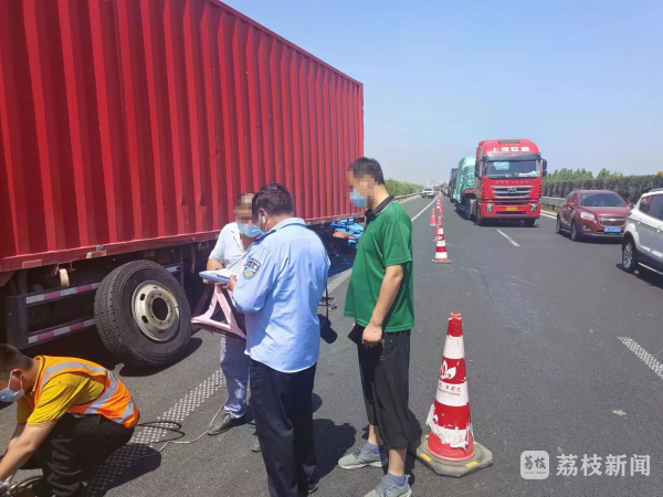 接到报警后,民警立即赶往现场。据了解,张某驾驶沪E牌照重型厢式货车,由徐州至淮安运送货物,行驶至173公里处时,左前轮突然爆胎,便将车辆停至应急车道,打开双闪,并在车辆后方摆放好警示标志后拨打了救援电话,等待救援车辆的到来;就在张某等待救援车辆期间,葛某驾驶的一辆冀T牌照轻型仓栅式货车径直撞了上来,导致追尾事故发生。