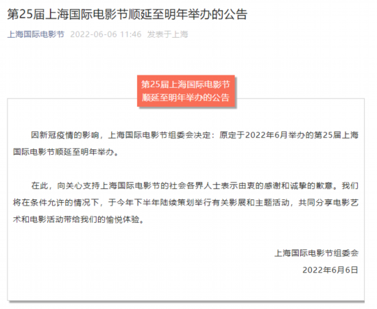 荔枝新闻讯 据上海国际电影节微信公众号6日发布公告称,“因新冠疫情的影响,上海国际电影节组委会决定:原定于2022年6月举办的第25届上海国际电影节顺延至明年举办。”