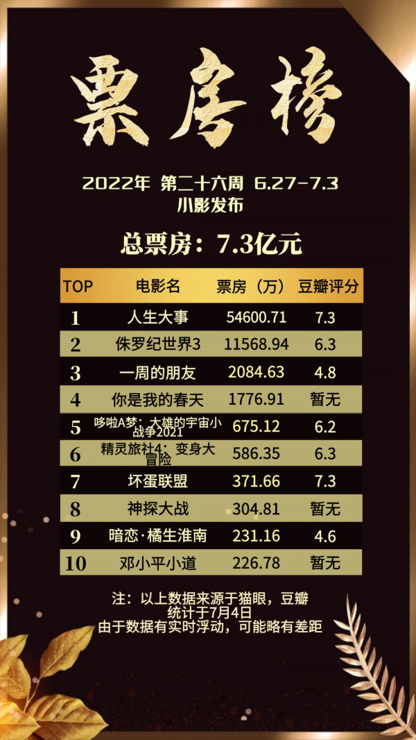2022年第26周内地电影总票房7.36亿,环比增长51.5%,《人生大事》《侏罗纪世界3》双片票房贡献大盘超80%,抗疫主题影片《你是我的春天》首周3天累计票房1777万。