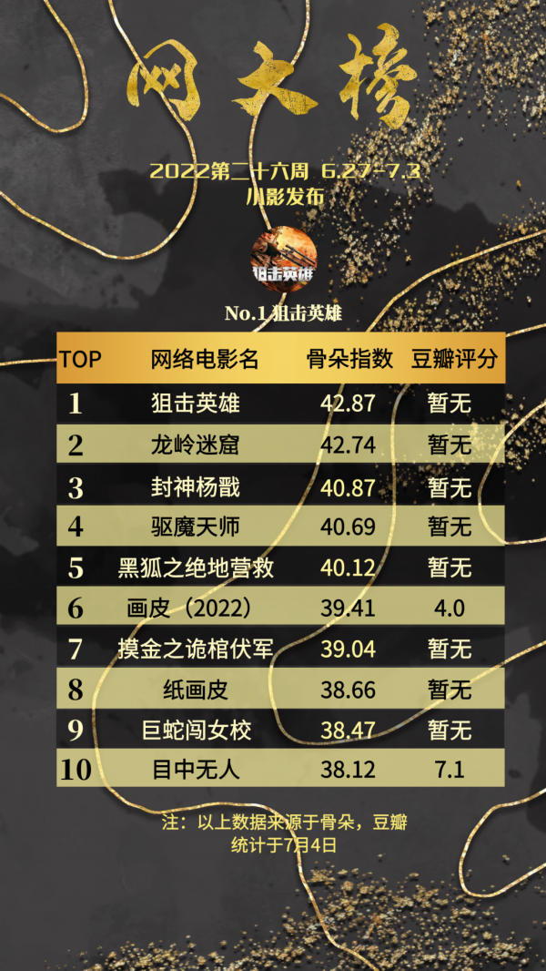 本周网大榜,战争片《狙击英雄》荣登榜首,该片演员及主创班底均来自于《我是特种兵》系列剧。故事背景锁定抗美援朝战争后期,讲述了有着出色射击天赋但也有心中阴影的狙击手任东风在“特射班”班长高占奎和战友们帮助下,与美军狙击王牌舒尔曼展开了一场壮烈的狙击大战。
