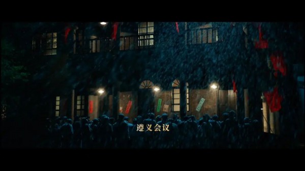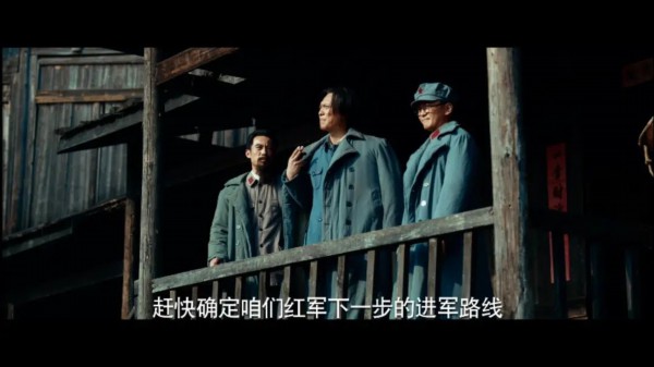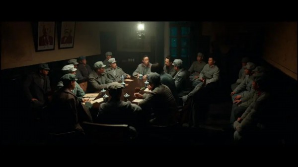 这段戏,以一个全景开头,大雪纷飞,交代环境,会场内外交叉剪辑,会场内两种观点交战,仅仅关键词式地呈现了博古和王稼祥、周恩来和毛泽东的发言,并以字幕的形式交代了重要与会人员,会场外两个战士交谈,短短几句对白,就将会议的胶着、指挥的错误以及对现状的不满,刻画得力透纸背,由此,受众很自然地就会觉得,这漫天纷飞的大雪,不仅仅是自然天气的写照,更暗示着长征的形势严峻和会议的斗争激烈。