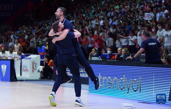 7月17日,塞尔维亚队球员(前)在比赛中庆祝得分。新华社记者 沙达提 摄