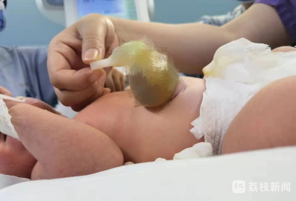 今天,记者从南京市妇幼保健院了解到,安徽华女士(化姓)在当地产检查出胎儿脐膨出,经朋友介绍来到南京市妇幼保健院分娩。宝宝一出生,肚脐上就“挂”着一个鸡蛋大小的“包”,属于“先天性巨型脐膨出”,需立即进行手术。