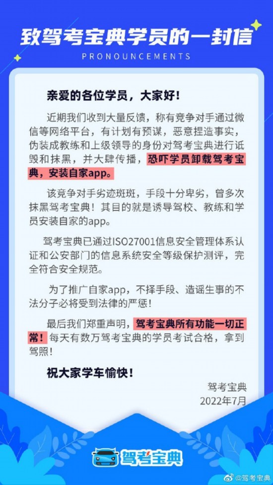 声明显示,驾考宝典已通过ISO27001信息安全管理体系认证和公安部门的信息系统安全等级保护测评,完全符合安全规范。公司称,驾考宝典所有功能一切正常,每天有数万驾考宝典的学员考试合格,拿到驾照。