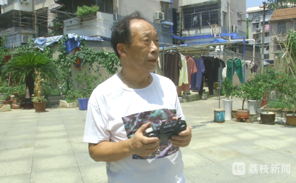 走进虎踞北路53号小区,在一处空地记者见到了创作这段微视频的作者张春源,原来,眼前的这位“80后”是位80岁的老人。手指匀速的拨动着摇杆,眼睛紧盯着移动的航拍小飞机,拍得入神的他似乎忘记了头顶上的似火骄阳。张春源说,你要不炸机,飞得平稳飞得好,手要慢慢上去慢慢下来,如果很快上去了,画面就不行了,另外要注意返航地,我起飞地和返航地误差只有0.5米。