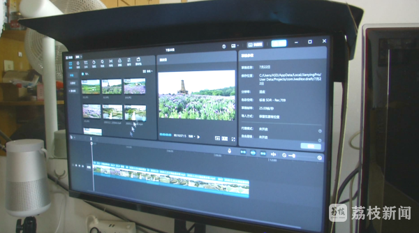拍到了满意的素材,张春源老人邀请记者到家里坐坐,一张床、四台电脑、五部摄影器材,墙上挂满了各种电子设备,张春源告诉记者,退休后,他把面积不算大的卧室改造成了“摄影工作室”,每当拍到了满意的视频,他都会自己动手制作剪辑。张春源说,这是航拍的,比如我这里要剪辑,点这里,如果要加字幕,单排字体还是双排字体都预设好了,是怎么读出来呢,点朗读,这么多配音,新闻男声女声都有。