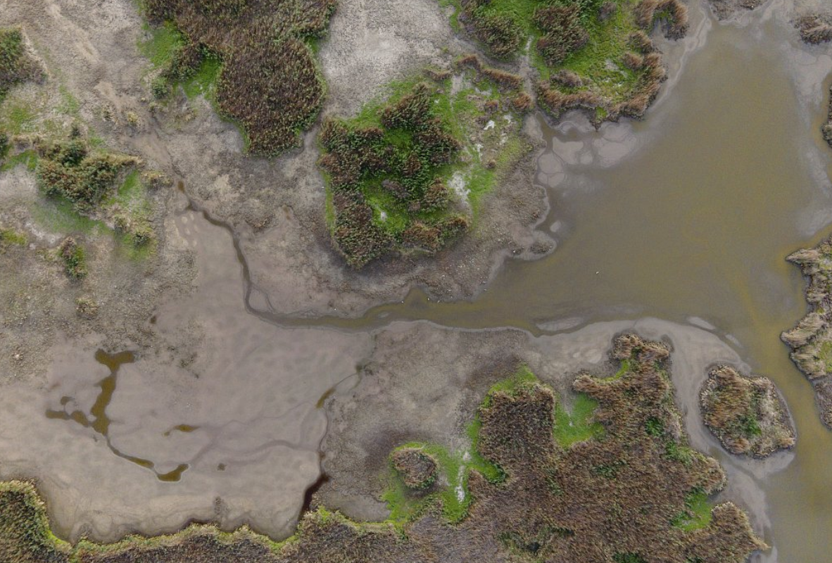△当地时间7月28日,匈牙利巴科兹德,航拍照片显示韦伦斯湖芦苇旁泥浆干燥,水量消退。