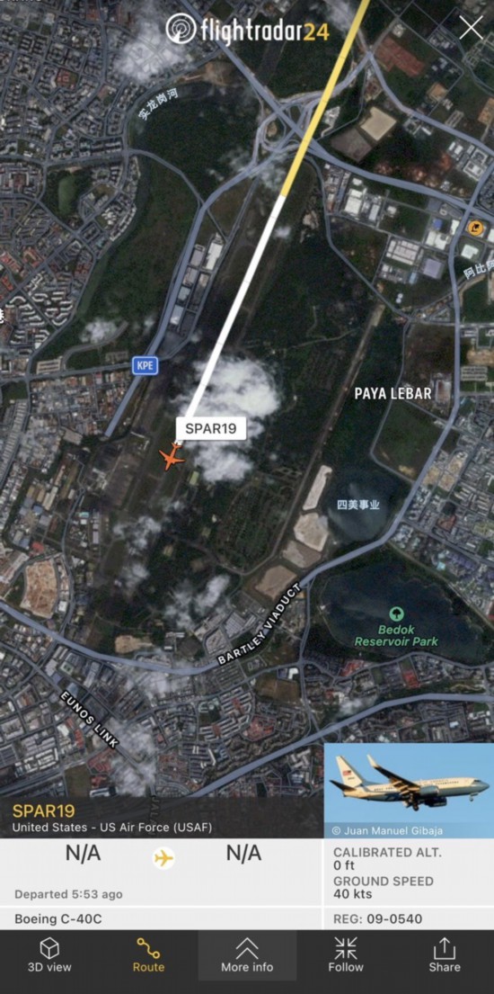FlightRadar24显示的佩洛西专机C-40C降落新加坡巴耶利峇空军基地截图