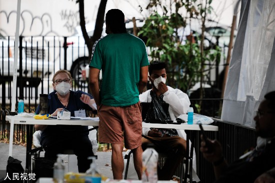 当地时间2022年7月29日,美国纽约,纽约市健康和心理卫生部门的医护人员在帐篷内工作,人们登记接种猴痘疫苗。人民视觉 图