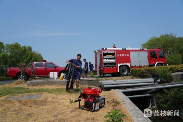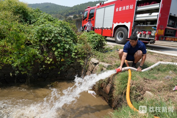 8月13日,苏州市消防救援支队抗旱应急救援小分队迅速集结,为旱情较为严重的金庭镇送去水源。消防员分组来到各村,接好接口、启动水泵,拧开车上的出水阀开关,让水快速流入水塘。在农户的带领下,消防员找到附近水源,利用消防水带和机动泵,铺设供水干线进行注水,同时协助村民铺设上山灌溉的水带。