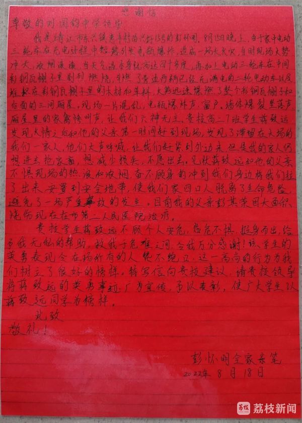 “感谢贵校高二(7)班学生蒋致远同学在面临危险时,能够伸出援手,关键时刻挺身而出……”今日(8月21日)一早,靖江市刘国钧中学收到了一封特别的感谢信,写信人是靖江市东兴镇东埭一位68岁的老人。时间已经过去一周,直到收到感谢信,蒋致远救火的事迹才被学校所知晓。