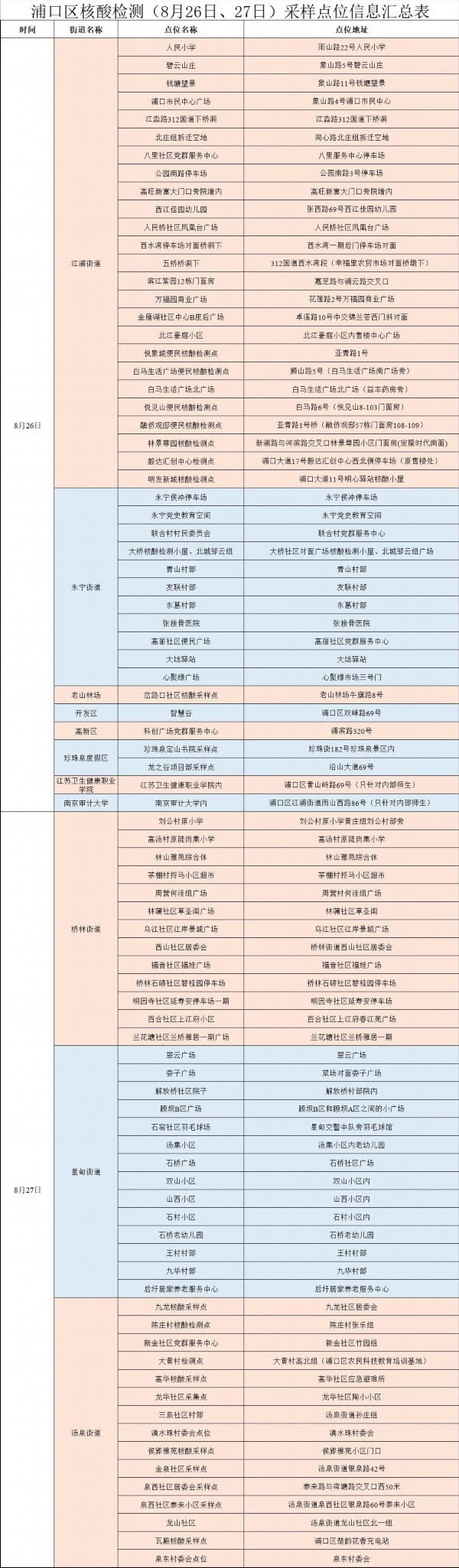 我苏网讯 根据当前疫情防控工作需要,为了您的健康和防护安全,浦口区新冠肺炎疫情联防联控工作指挥部决定于8月26日、27日分区域开展核酸检测工作,现将有关事宜通告如下: