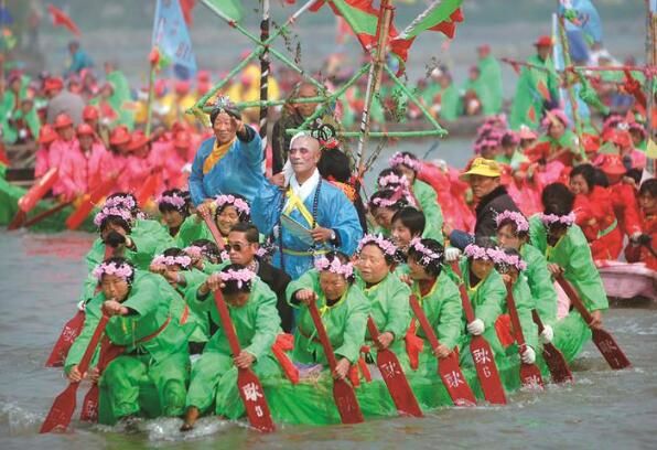 湖南村村民为游客表演会船。