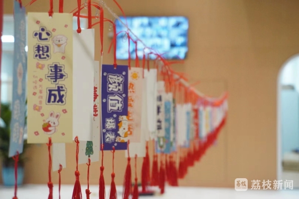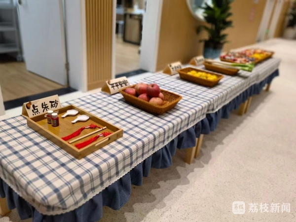 “你摸一摸苹果,祝你平平安安;摸一下橘子,祝你大吉大利;摸一下大葱,祝你聪明伶俐;最后请你选一个最喜欢的棒棒糖,祝你越来越棒!”禄口玉振路幼儿园精心布置了寓意满满的入园礼,每一件物品都饱含着老师对萌娃们最真挚的祝福。幼儿园园长曹揽月还在孩子们的额头上点上朱砂,寓意孩子从此开启智慧,目明心亮。在幼儿园大厅里的几根细绳上,系满了各类祝福语,孩子可以根据自己的喜好摘取一个,讨个“好彩头”。