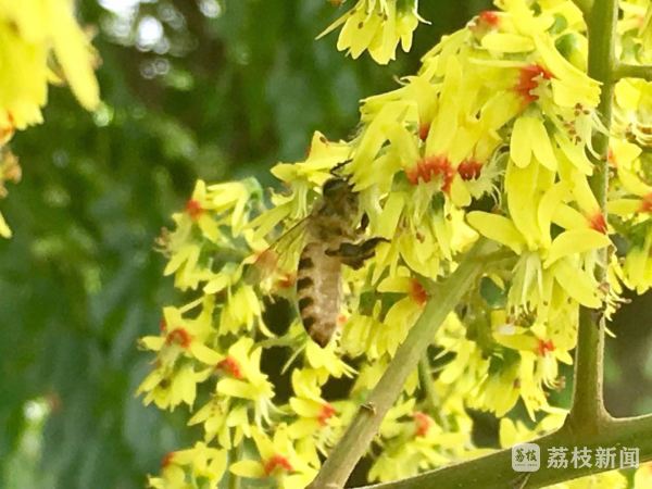 时值白露节气,正是南京一年中最美的季节。 在南京公共卫生医疗中心院内道路边看到,一株株栾树正值盛花期,金灿灿的花朵散发出淡淡的花香,“色香味俱佳”。花朵盛开,花心处的红蕊引得蜜蜂围绕,似能为市民游客及患者带去一份甜蜜。