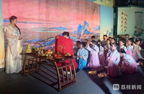 一对红烛,一尊香炉,三只爵杯;子孙藕,九层糖面饼,四角菱,石榴,月饼……晚上7点,仁丰里古街北入口处,被列为江苏省非遗项目的扬州拜月仪式,已经摆开了阵式。“中秋拜月”是扬州自古流传下来的传统民间风俗仪式,它诞生于宫廷,后来贵族仿效,又逐渐扩展到民间。扬州的先民们在这一天祭拜月亮,祈求举家团圆、人丁兴旺、国泰民安。扬州在历史上留下了诸多颂月的诗篇和记载,清代文人厉惕斋的“十五日中秋,晚间祀月,香肆买月公纸,范为牌位,供之案上”,正说明扬州“中秋拜月”历史的悠久。