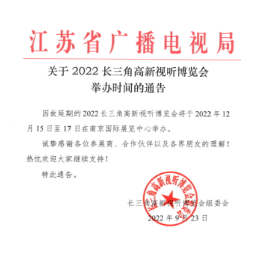 因故延期的2022长三角高新视听博览会将于2022年12月15日至17日在南京国际展览中心举办。