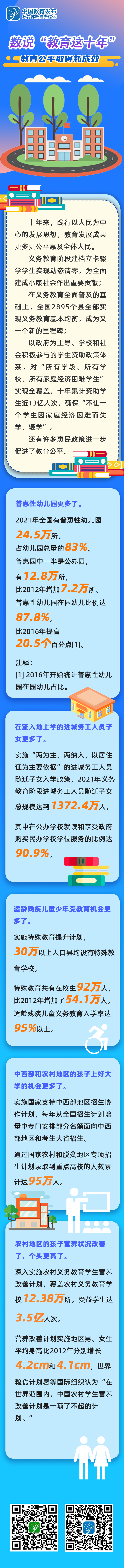教育是国之大计、党之大计。党的十八大以来,我国教育面貌正在发生格局性变化。教育部政务新媒体推出“教育新征‘图’”专栏,“图”说教育这十年,迎接党的二十大胜利召开。今天推出的是“图”说十年来教育公平取得的新成效——