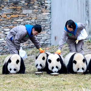 饲养员在为大熊猫喂食营养早餐。(中国大熊猫保护研究中心供图)