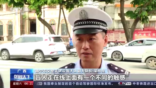 南宁市交警支队设施大队副大队长梁桦坚:盲人走在线上面有一个不同的触感,知道他走在相当于人行道的盲道,给他脚感触碰,各方面能够识别到方向。