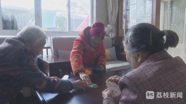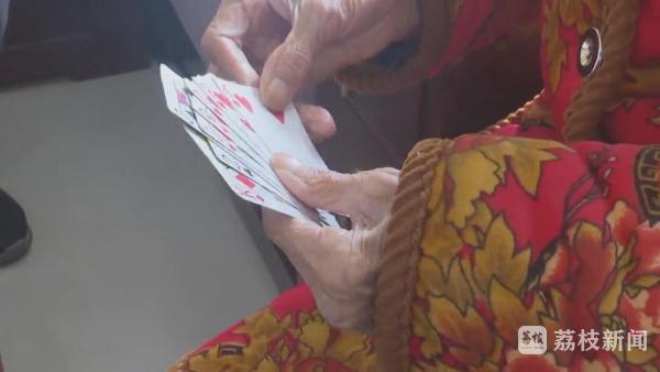 老人家百岁高龄了,听力有些自然衰退,但身子骨很硬朗,与人交流思维清晰。想不到,老太最爱的娱乐消遣居然是打扑克牌!这不,趁着热闹劲儿,又摆上了。别看牌友都七八十岁了,一问,都是小辈啊。