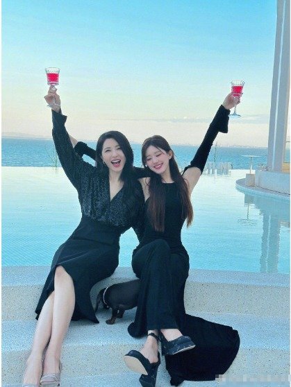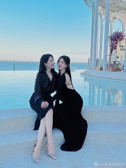 曾黎赵露思坐泳池边合影。