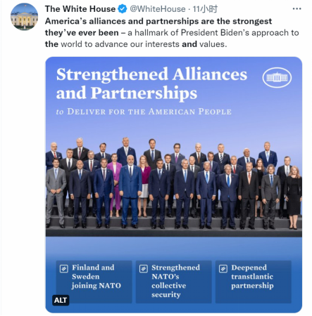 白宫当地时间27日发推称,“美国的联盟和伙伴关系是有史以来最强大的——这是拜登总统为推进我们的利益和价值观所采取的标志性行动之一。”推文配图中,除美国及其盟国领导人合照外,图中还用文字提及,这项行动包括:让芬兰和瑞典加入北约,加强北约集体安全,深化跨大西洋伙伴关系。