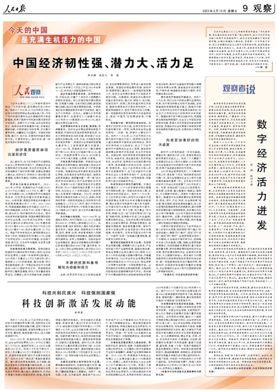 习近平主席在二〇二三年新年贺词中指出:“今天的中国,是充满生机活力的中国。”进入新时代,在以习近平同志为核心的党中央坚强领导下,我们历史性地解决了绝对贫困问题,如期全面建成小康社会,实现第一个百年奋斗目标,迈上全面建设社会主义现代化国家新征程,我国发展站在新的更高历史起点上。抗疫3年,我国经济发展交出举世瞩目的成绩单,经济年均增长4.5%,远高于同期世界经济约1.8%的年均增速,在世界主要经济体中保持领先。本期观察版从经济发展、数字经济、科技创新三个方面,分析中国经济长期向好的基本面依然不变、生机活力不断焕发,只要笃定信心、稳中求进,就一定能实现我们的既定目标。