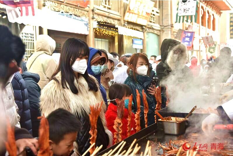 青海平安驿·河湟民俗文化体验地,游客们在小吃摊前排队。人民网 陈晶摄