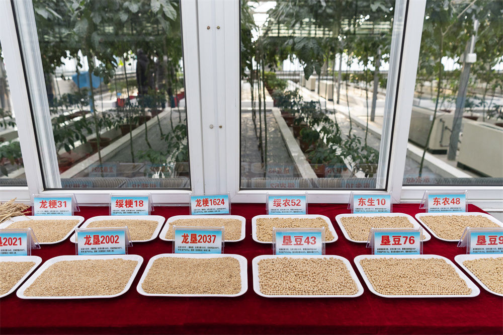 这是黑龙江省富锦市北大荒建三江国家农业科技园区内展示的水稻和大豆品种(1月9日摄)。新华社记者 谢剑飞 摄