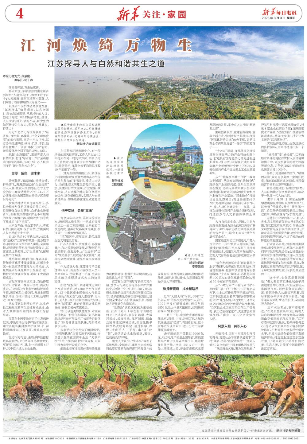 3月3日,新华每日电讯 新华关注·家园刊载题为《江河焕绮万物生 江苏探寻人与自然和谐共生之道》的报道。