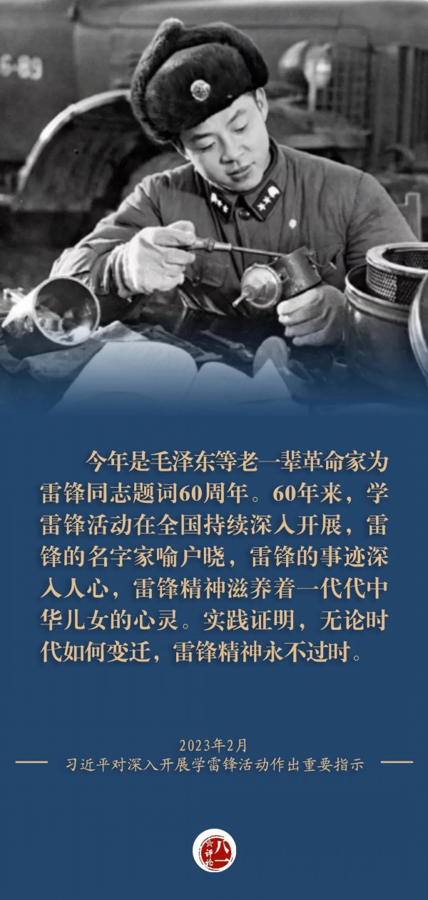 在毛泽东等老一辈革命家题词60周年之际,习近平总书记又专门对深入开展学雷锋活动作出重要指示,强调“无论时代如何变迁,雷锋精神永不过时”,要“让学雷锋活动融入日常、化作经常,让雷锋精神在新时代绽放更加璀璨的光芒”,为新时代更好弘扬雷锋精神指明了方向。