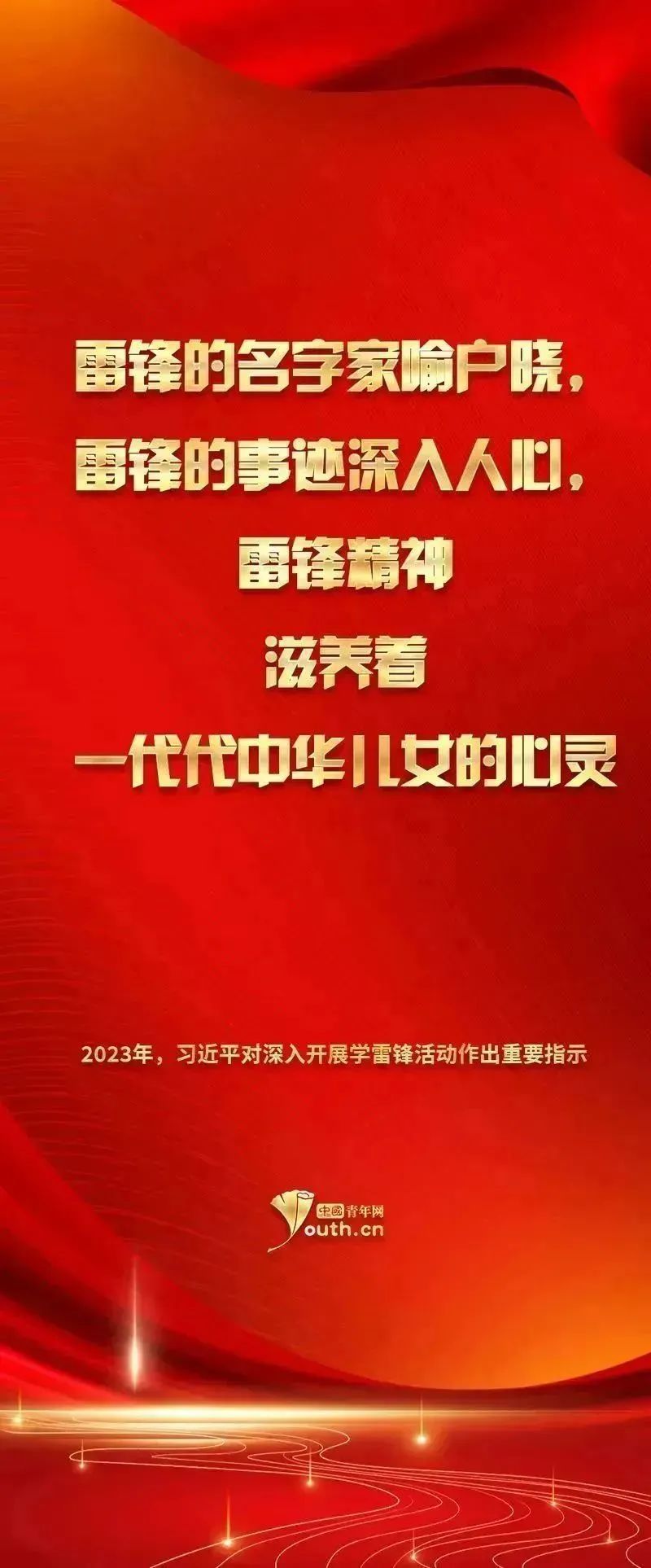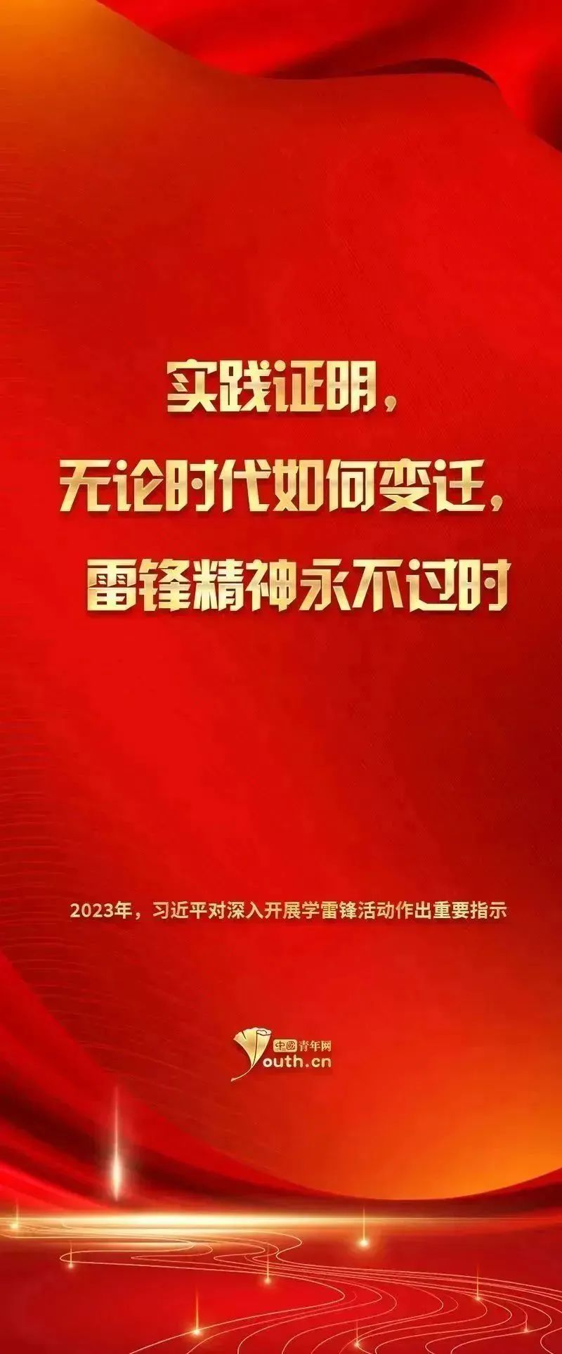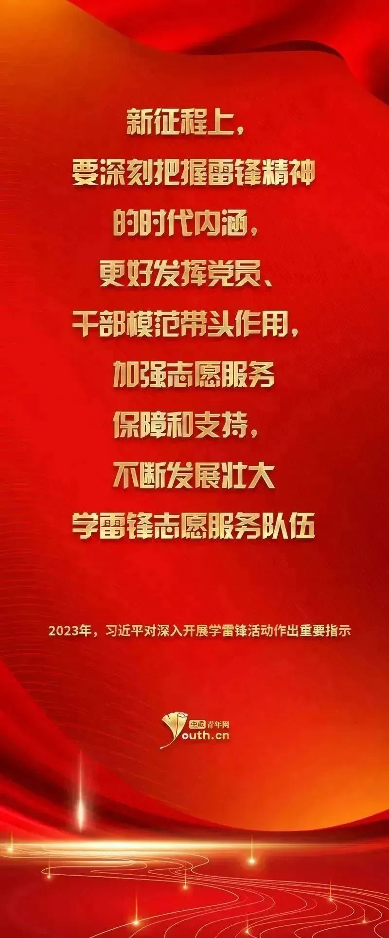 雷锋同志是一名优秀的共产党员,他的一生虽然短暂,却是自我激励、自我价值实现的完美典范。新时代的发展需要雷锋精神,“向雷锋同志学习”永远不会过时。雷锋精神既集中体现了以集体主义为原则、以为人民服务为核心的社会主义思想道德本质,也集中体现了爱国奉献、以天下为己任的中华民族传统美德,是时代精神和民族精神的完美结合。雷锋精神反映了新时代社会主义公民的新特点,给人们树立了一个社会主义公民的榜样,其本质指明了一代新人的精神境界和希望。而青年恰恰是这种精神的传承者和发展者,在雷锋精神的引领下,新时代青年能够更好地激发爱国主义热情,更加自觉将个人追求融入为党和人民事业的伟大奋斗中,努力推进中国式现代化建设,为实现中华民族伟大复兴贡献力量!