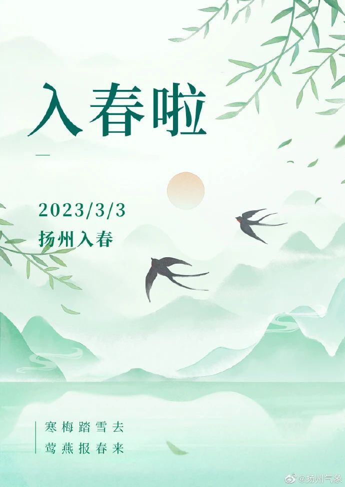 据扬州市气象台最新消息,2023年扬州3月3日入春,气象意义上的春天来啦!