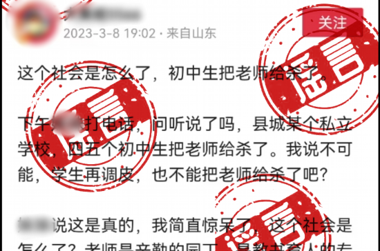 2023年3月9日,莘县公安局网安大队在日常巡查中发现,某网民于3月8日在某公众平台发布“这个社会是怎么了,初中生把老师给杀了......”“县城某个私立学校,四五个初中生把老师给杀了......”等信息内容,引发大量关注,对部分网友造成误导。