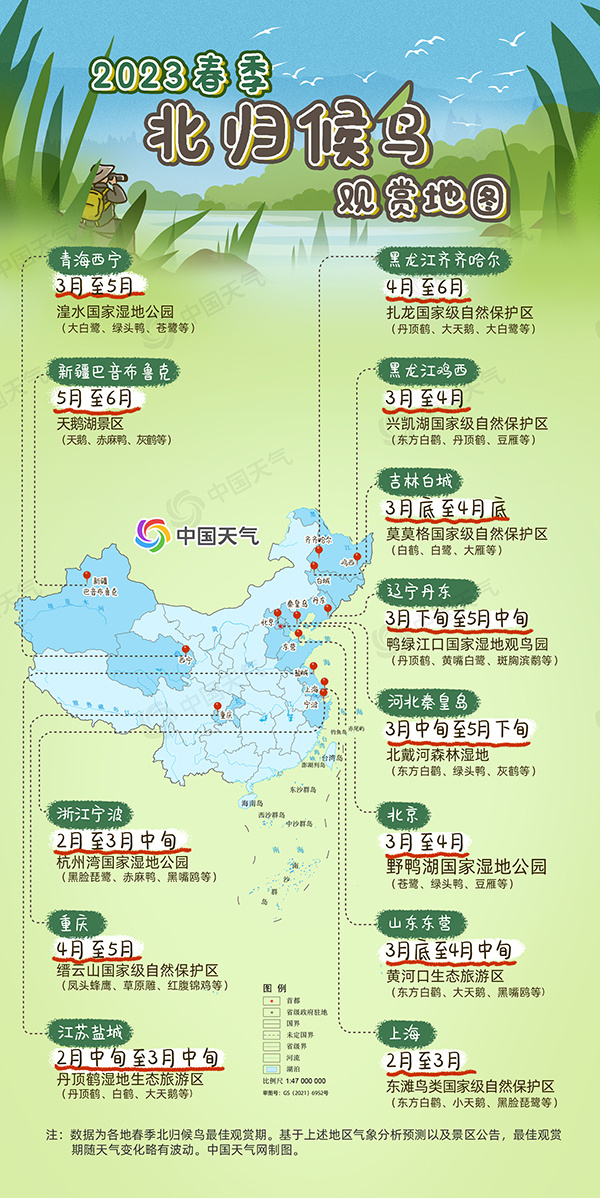 从中国天气网推出的2023年春季北归候鸟观赏地图可以看到,2月,南方多地开启回暖模式,作为候鸟迁徙“加油站”的浙江宁波杭州湾国家湿地公园、上海东滩鸟类国家级自然保护区、江苏盐城丹顶鹤湿地生态旅游区等地陆续进入观赏期。大批珍稀候鸟入境抵达这里,时而腾空盘旋,时而潜水觅食,为初春增添了无限生机。进入3月,气温进一步升高,它们也陆续北上。