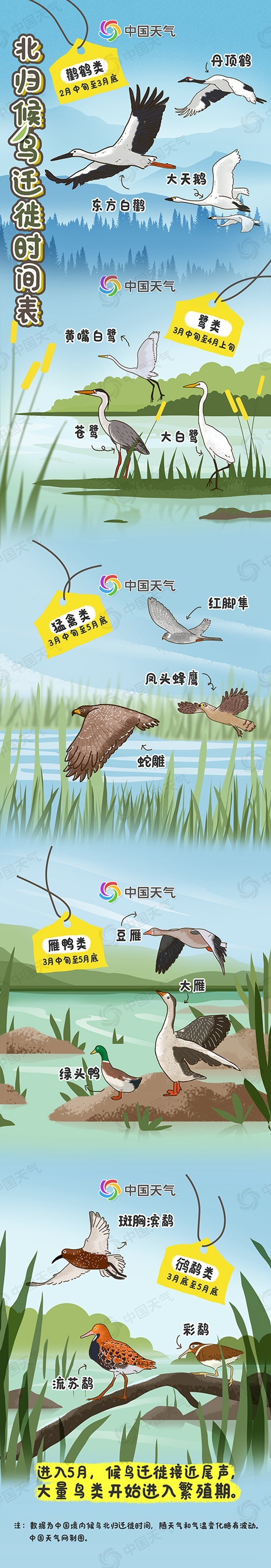 从中国天气网推出的北归候鸟迁徙时间表来看,以东方白鹳、丹顶鹤、大天鹅等为代表的鹳鹤类,春季北迁时间为2月中旬至3月底。苍鹭、大白鹭、黄嘴白鹭等鹭类作为湿地生态系统中的重要指示物种,春季北迁时间在3月中旬至4月上旬。处于食物链顶端的红脚隼(sǔn)、凤头蜂鹰、蛇雕等猛禽类和喜爱集群生活的大雁、豆雁、绿头鸭等雁鸭类,春季北迁时间通常都在3月中旬至5月底。流苏鹬、彩鹬、斑胸滨鹬等鸻鹬(héng yù)类,是地球上迁徙距离最远的鸟类,春季北迁时间为3月底至5月底。