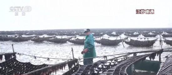 除了播种的忙碌,也有收获的喜悦。在江苏南通的如东县,15万亩条斑紫菜迎来了收获时节。为了提升收割效率,养殖工人们在近海,利用半浮动筏式紫菜采摘机进行采摘;到了远海区域,则直接上船采摘。