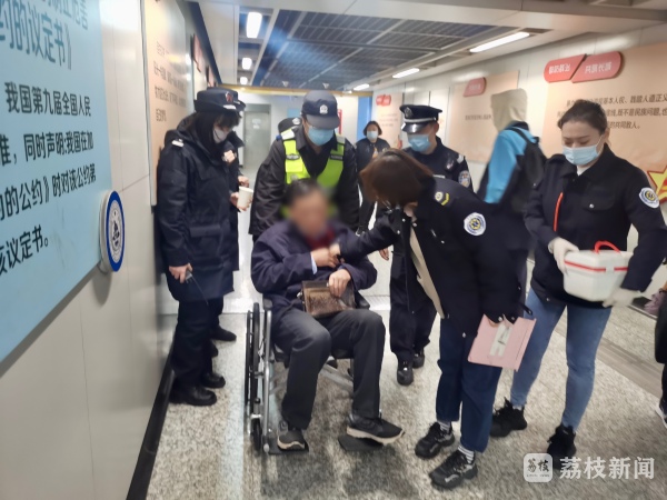 3月13日15时许,王女士虚弱地走进地铁南京南站警务工作服务站,表示自己突然感到头晕、头疼,且脖子无法转动。民警听闻立即将王女士搀扶至座椅上休息,并帮助拨打120急救电话。经询问得知,王女士向来身体健康,并无病史,但当下面色苍白,且屡次近乎昏迷,女警刘聪文见状一直蹲在王女士身侧,寸步不离地陪伴,期间,帮助联系其在南京的朋友,帮忙按摩手部穴位,观察其身体状态,并在必要的时候轻拍呼唤,防止她陷入昏迷。很快急救人员赶到,民警们立即配合医护人员将王女士送往医院治疗。