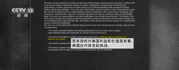 该组织在声明中,明确指出“作为当今世界的唯一超级大国”,美国应扩大和保持“全球霸权”。“若有政权对美国利益和价值观有害,美国应对其发起挑战”。