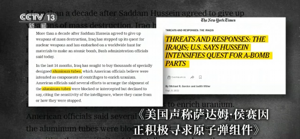 2002年9月,有匿名官员故意将这一消息透露给了《纽约时报》。后者以《美国声称萨达姆·侯赛因正积极寻求原子弹组件》为题,对这一未经证实的情报大肆炒作。几个小时后,白宫政客迅速跟上。