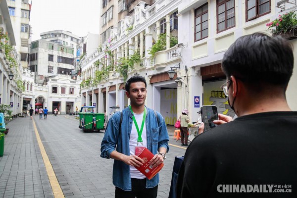 4月10日,“中国有约” 中阿卫视记者采访骑楼历史文化街区。