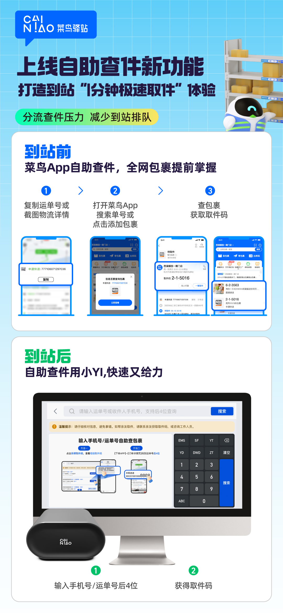 据了解,此次自助查件功能升级分为到站前、到站后两种提速方式,用户可根据习惯偏好自行选择。消费者到达菜鸟驿站前,可使用菜鸟App通过复制电商平台的快递单号查询、导入截图的物流详情页等方式,获取多电商平台包裹的取件码,提前掌握包裹位置。用户到达站点后,可使用小Yi自助查件区的电脑、触摸屏设备,输入收件人手机号后4位或包裹运单号后4位,在通过身份验证后,即可获取快递取件码。